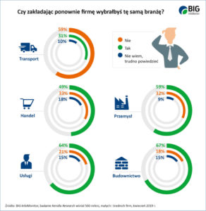 Co byś chciał robić w przyszłości? Na pewno nie to co teraz, odpowiada co trzeci przedsiębiorca. Najbardziej zniechęceni są przedstawiciele firm transportowych. 6 na 10 nie podjęłoby się ponownie uruchomienia firmy w tej branży. Kolejne miejsca w zestawieniu „drugi raz nie wszedłbym do tej samej rzeki”, zajęły handel i przemysł. Dość ma tu 3 na 10 przedsiębiorców. Najlepiej jest w usługach i budownictwie, ale i tu kolejny raz nie podjęłoby się działalności 2 na 10 – wynika z badania przeprowadzonego na zlecenie Rejestru Dłużników BIG InfoMonitor przez Instytut Keralla Research wśród mikro, małych i średnich firm.