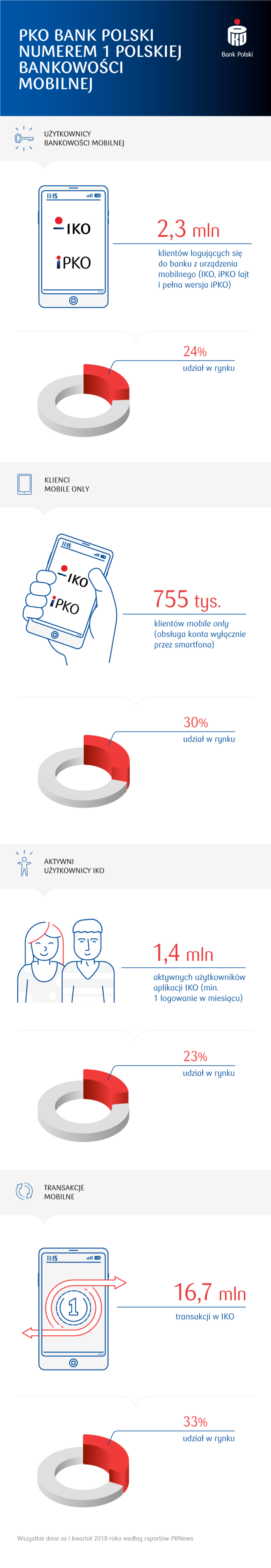Portal PRNews co kwartał zestawia najważniejsze dane dotyczące bankowości mobilnej w Polsce. Raporty za I kwartał br. pokazują, że PKO Bank Polski umocnił się na pozycji lidera bankowości mobilnej w Polsce. 2,3 miliona klientów PKO i Inteligo korzysta z banku za pośrednictwem urządzenia mobilnego (IKO, wersja lajt i pełna wersja serwisu iPKO), aplikacja IKO ma 1,4 mln aktywnych użytkowników (min. 1 logowanie w miesiącu), a aż 755 tysięcy osób obsługuje swoje finanse tylko za pomocą smartfona („mobile only”). Ponadto w I kwartale klienci największego polskiego banku wykonali prawie 17 milionów transakcji mobilnych, o 10 milionów więcej niż przed rokiem.