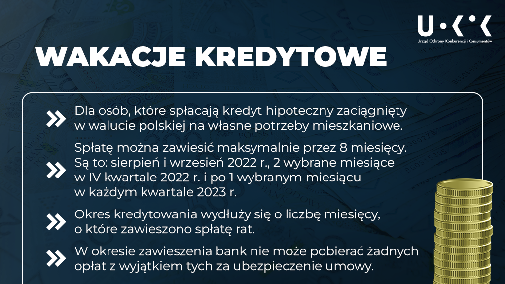 W czasie wyższych kosztów utrzymania gospodarstw domowych i rosnących stóp procentowych, które przekładają się na wysokość rat kredytów, wakacje kredytowe to duża ulga dla kredytobiorców i ich rodzin. Skorzystanie z nich pozwala nie tylko ograniczyć koszty obsługi kredytu hipotecznego przy wysokich stopach procentowych, ale również przeznaczyć zaoszczędzone środki z rat na nadpłatę kredytu lub tzw. „poduszkę finansową” na trudne czasy. Dlatego istotne jest, by unikać przeznaczania tych środków na bieżącą konsumpcję, a wykorzystać je choćby do nadpłaty kredytu, dzięki czemu obciążenia finansowe już po wakacjach kredytowych mogą być niższe – mówi Tomasz Chróstny, Prezes Urzędu Ochrony Konkurencji i Konsumentów.